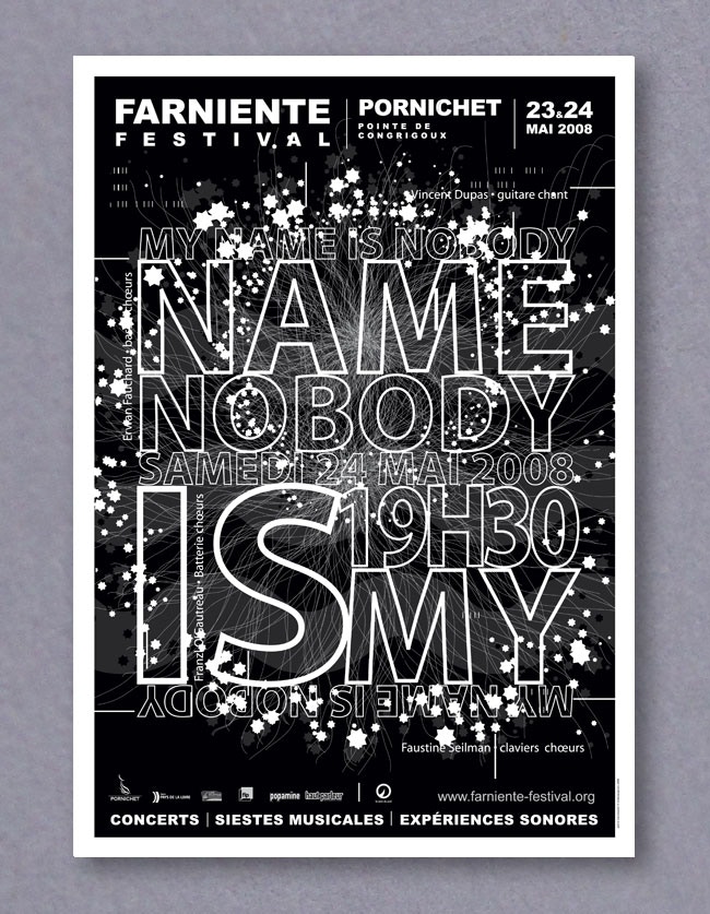 L’idée principale de ces affiches est simple : évoquer la rencontre du lieu avec la musique. Le ciel et la mer, la nuit, des sons étranges et mystérieux. Une recherche d’espace, de rythme, de profondeur…